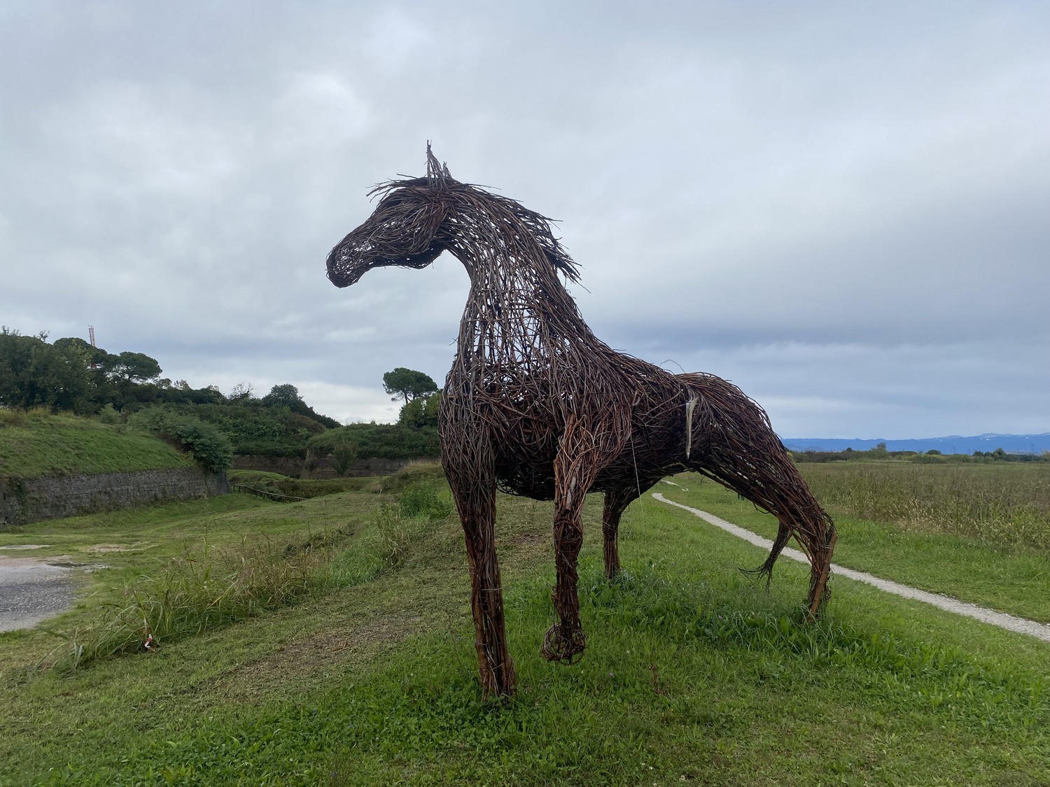 rözse lóMagányosnak tűnik, de nem az.  A szabadság utáni vágy Jelképe. Nem véletlen, hogy alkotója kicsapta a rétre, erőt, dinamizmust adva neki. Él is vele, minden részlete finoman kidolgozott, eleganciája természetes. Ugrásra, vágtára kész, miközben uralja a tájat. Számtalan lovas szobrot ismerünk kőből, vasból, bronzból agyagból formáltat. Ágból, rőzséből ritkán készül. Nem akarnék felpattanni rá, elég csak nézni. Lehet, hogy játékból készült, de feltámadott, lábra kapott. Nem Pegazus, de ha elindul, sok kalandban lesz része. Tág teret, harmatos mezőt kívánok neki.