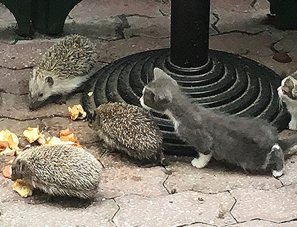 Minden háborút felülír az éhség, legalábbis a macskák részéről. A sünök igazuk és tüskéik birtokában nem vitáznak, a macskákra ügyet sem vetve vacsoráznak. A kép idilli, mert amikor eljön az este, a sünöknek kirakott falnivalót a macskák szélsebesen elhordják felfalják. A napközben bokor alatt gilisztázó sünök, estére lelassulnak, felveszik a nyugdíjas tempót, és az éj leple alatt komótosan battyognak a vacsorázó helyre. Ahol hűlt helye a kajának. Megesik a szívem rajtuk, viszek nekik repetát. Amiért hálásan böfögnek. A macskák tisztes távolról figyelnek, tervet szőnek. A sünök visszatotyognak a rejtekükbe és álmodnak. Kinyújtózva, elkergetett macskákról.